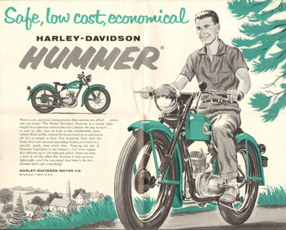 The Hummer was a motorcycle model manufactured by Harley-Davidson from 1955 to 1959. However, the name “Hummer” is now incorrectly used generically to refer to all American-made single-cylinder two-stroke Harley-Davidson motorcycles manufactured from 1948 to 1966. These motorcycles were based on the DKW RT125, the drawings for which were taken from Germany as war reparations after World War II. The RT125 drawings were also given to the United Kingdom and the Soviet Union as war reparations, resulting in the BSA Bantam and the MMZ M-1A Moskva, later known as the Minsk.